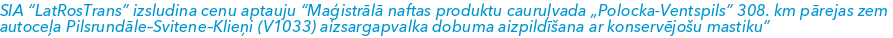 SIA “LatRosTrans” izsludina cenu aptauju “Maģistrālā naftas produktu cauruļvada „Polocka-Ventspils” 308. km pārejas zem autoceļa Pilsrundāle–Svitene–Klieņi (V1033) aizsargapvalka dobuma aizpildīšana ar konservējošu mastiku”.